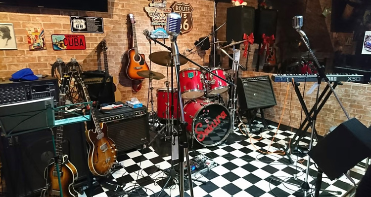 ドラム・ピアノ・ギターなどの楽器も揃ってます。 30~40名程度収容可能!貸切、宴会等も承ってます。 飲み放題、カラオケ無料! 料金 2H.男性/¥3000- 女性/¥2500- 延長 1H/¥1000-